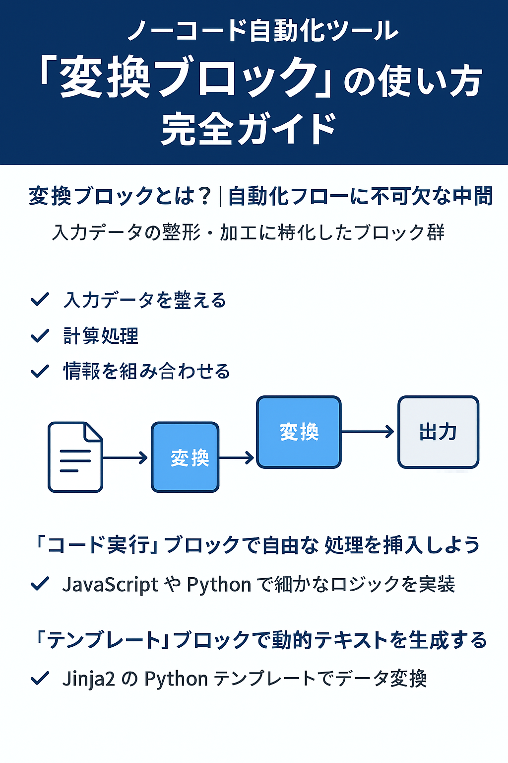 ノーコード自動化ツール「変換ブロック」の使い方完全ガイド 変換ブロックとは?|自動化フローに不可欠な中間処理 入力データの整形・加工に特化したブロック群 変換ブ…